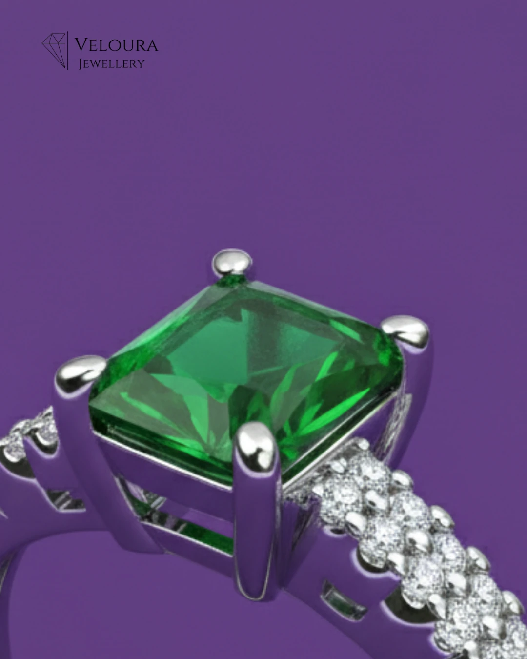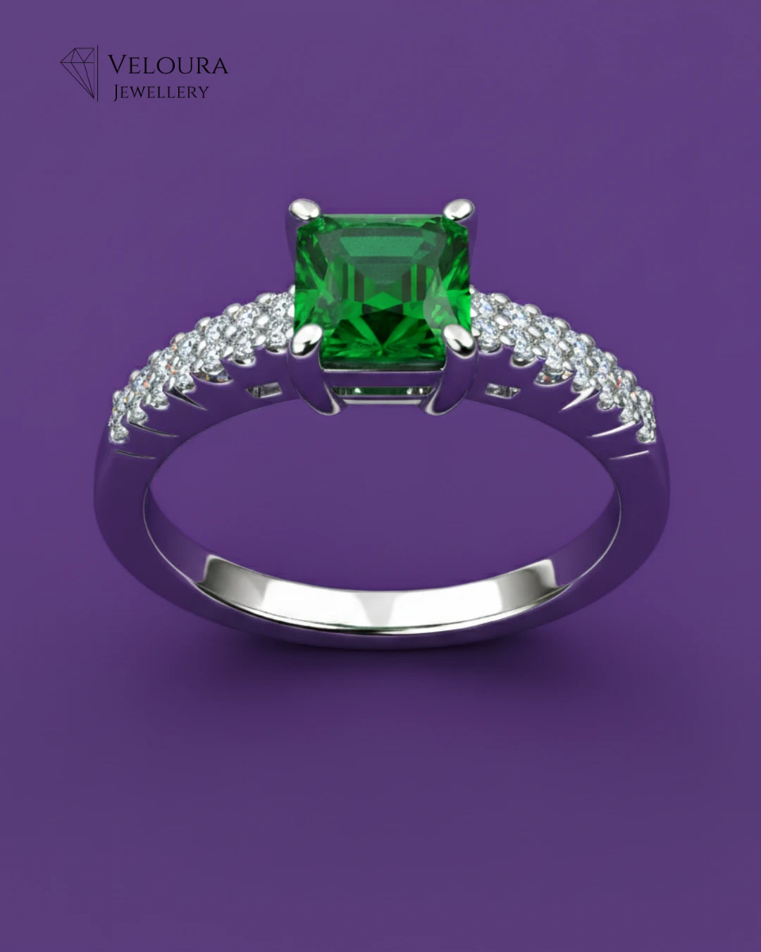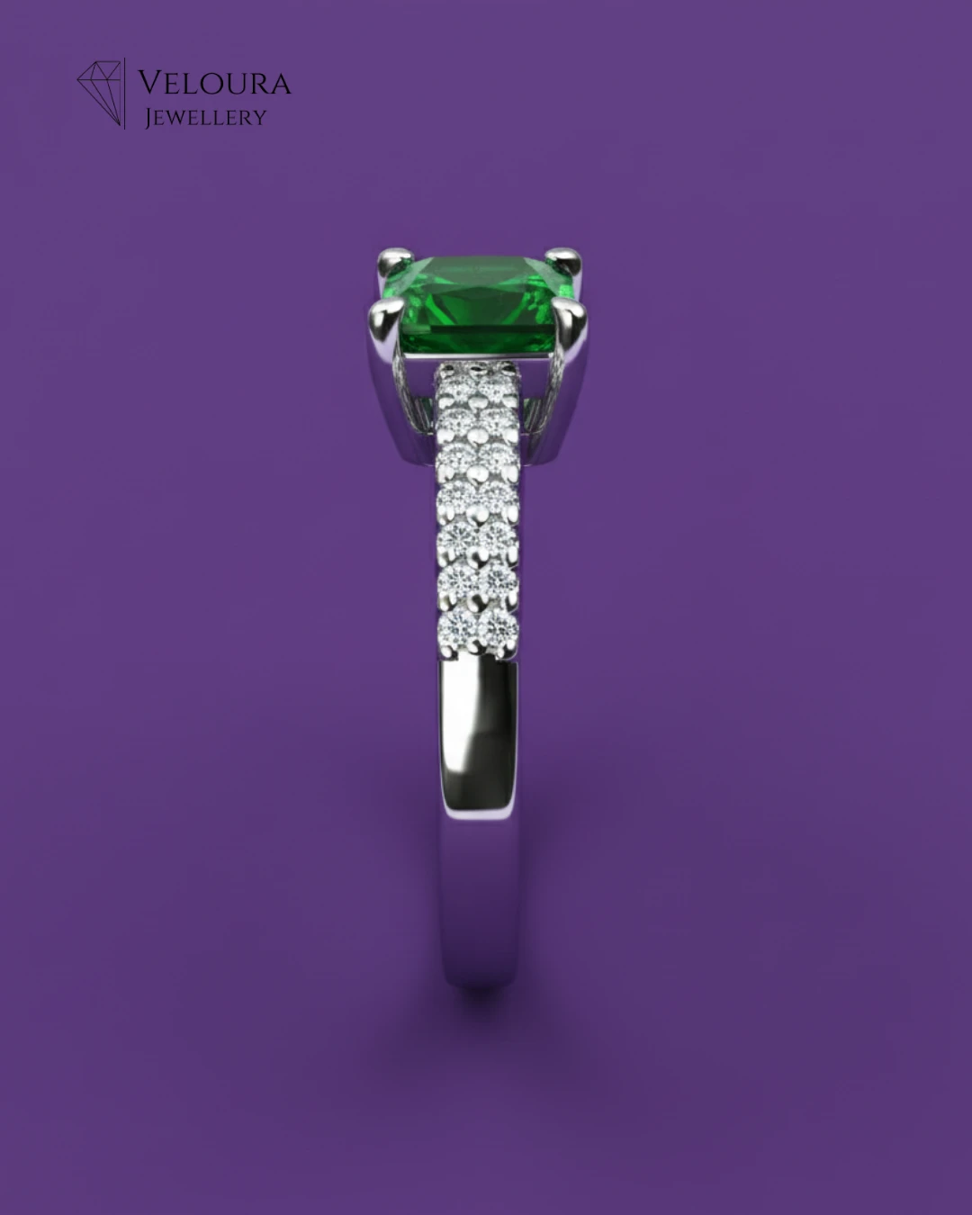 - Stone Cut: The main stone features a striking Radiant Cut green gemstone, complemented by Round Brilliant Cut accent stones.